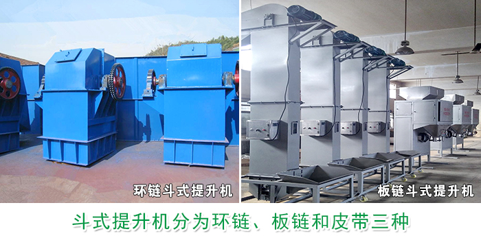 斗式提升机分为环链、板链和皮带三种,根据所提升的物料选择的料斗设计不同,其外形设计内部配置是不同的,环链式适用于输送粉状、小块状的物料,板链式适用于中、大块和有磨琢性的物料,皮带式适用于垂直输送粉状、且磨琢性较小的散状物料,选择不同种类的提升机造成价格上的差异化。