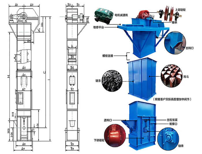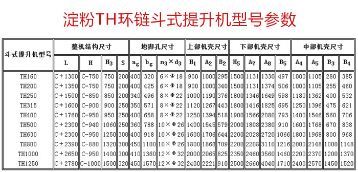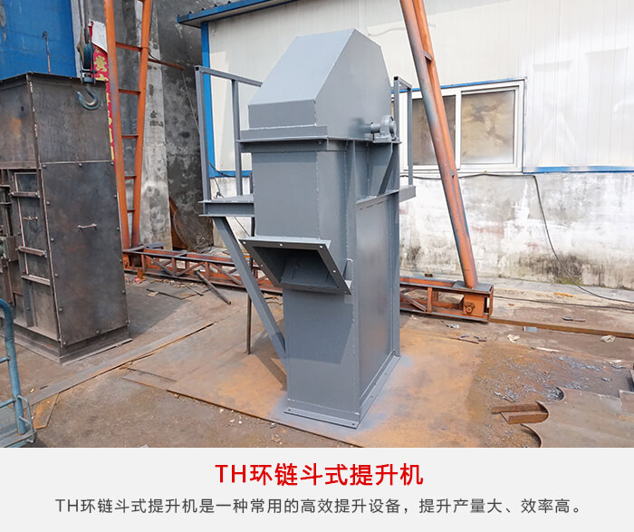 TH环链斗式提升机是一种常用的高效提升设备,提升产量大、效率高,主要由运行部件、牵引件(输送链)、驱动装置、上部装置、中部机壳、下部装置、加料口(入料口)和卸料口(出料口)组成。可适用与淀粉的高速提升输送。