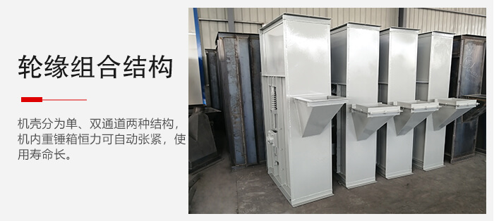 整机机壳分为单、双通道两种结构,机内重锤箱恒力可自动张紧,链轮为可更换轮缘组合式结构,更换简便;使用寿命长,