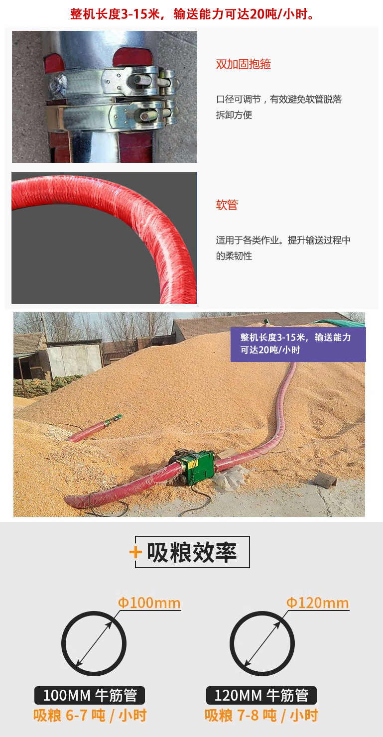 吸粮机长度为3-30米,每小时可输送20吨粮食。机器的重量是75公斤。它可以水平、倾斜或垂直输送谷物,粮食垂直输送时,每小时输送量可达6吨。