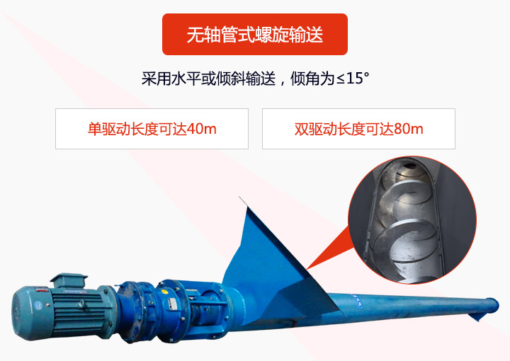 无轴管式香蕉视频下载地址链接也叫管式无轴香蕉视频下载地址链接,其外形为圆管式,可水平或倾斜输送,其倾角为≤15°,有双驱动和单驱动之分,单驱动螺旋机长度可达40m,双驱动螺旋机采用中间断开轴结构,长度可达80m。由于采用了无轴设计,可输送粘性强、易缠绕的物料,物料不易堵塞,排料口不堵塞。