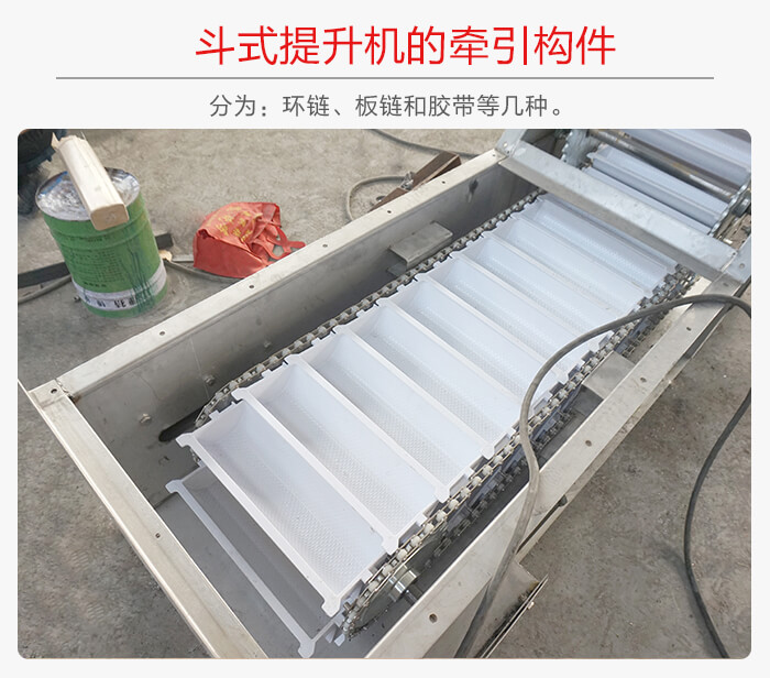环链的结构和制造比较简单,与料斗的连接也很牢固,输送磨琢性大的物料时,链条的磨损较小,但其自重较大。板链结构比较牢固,自重较轻,适用于提升量大的提升机,但铰接接头易被磨损,胶带的结构比较简单,但不适宜输送磨琢性大的物料,普通胶带物料温度不超过60°C,夹钢绳胶带允许物料温度达80°C,耐热胶带允许物料温度达120°C,环链、板链输送物料的温度可达250°C。