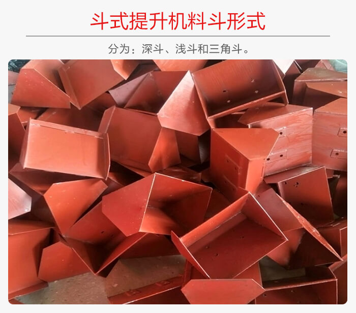 三角形料斗:深斗是具有导向侧边的三角形料斗,这种料斗在提升机中采用一个接一个的密集布置,当绕过上链轮卸料时,前一个料斗的两导向侧边和前壁形成后一个料斗的卸载导槽,这种料斗适于输送较重的、半磨琢性的、磨琢性大的块状物料。