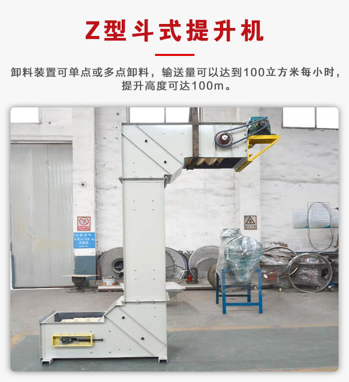 z型斗式提升机外形类似于“z”型,也叫做转斗式提升机,可以单点或多点加料,通过卸料装置完成单点或多点卸料,输送量可以达到100㎡/h,提升高度可达100m。