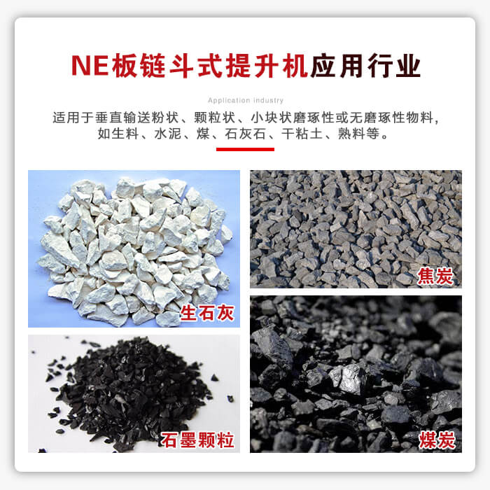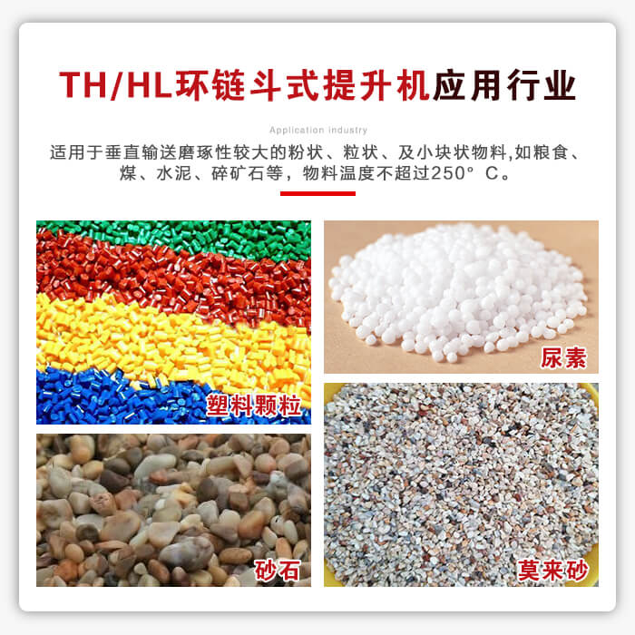 应用行业:适用于垂直输送磨琢性较大的粉状、粒状、及小块状物料,如粮食、煤、水泥、碎矿石等,物料温度不超过250°C。