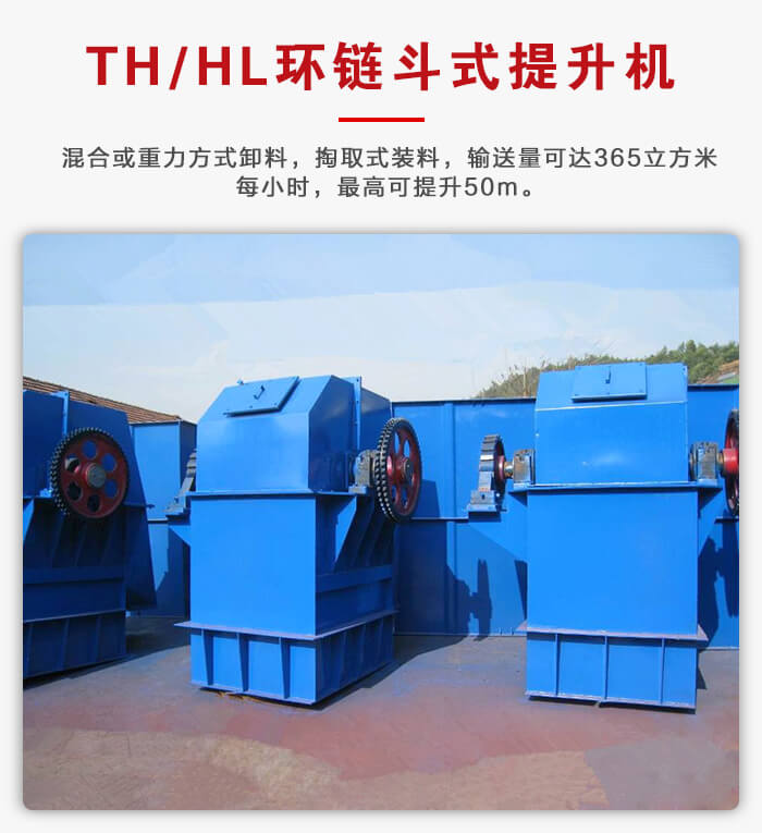TH/HL环链斗式提升机牵引机构是两根环形链条,为混合或重力方式卸料,掏取式装料,输送量可达365m³/h,最高可提升50m。